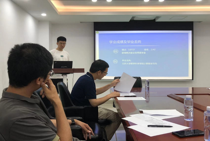 62日下午,数学科学学院举行2019拔尖计划毕业班考核。2019拔尖计划毕业生做毕业答辩汇报,并回答评委老师提出的相关问题。学院拔尖计划工作组宋翀教授、陈黄鑫教授、杜魁教授、周达副教授、杜妮副教授担任本次考核评委。